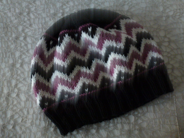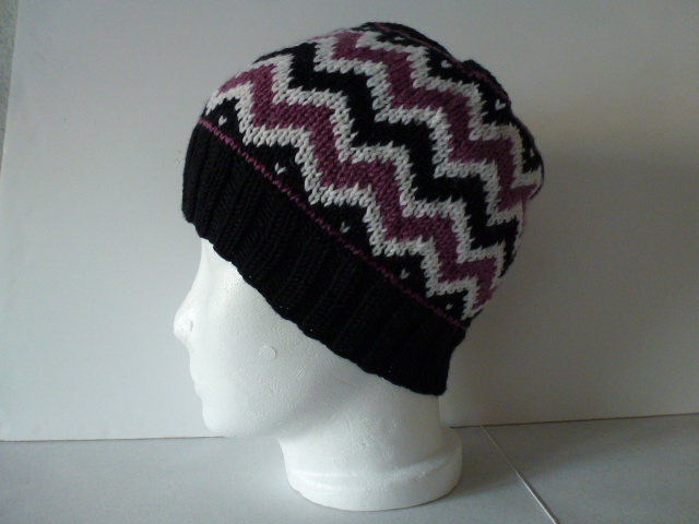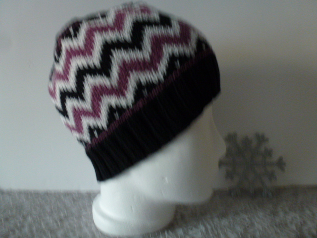 Leichte Jaquardmütze mit Zackenmuster. Die Mütze hat ein ca. 5cm breites, geripptes Bündchen. Am mittleren Mützenteil ist ein Jaquardmuster in schwarz, weiß und einem hübschen Beereton eingearbeitet. Der Oberkopf ist wie das Bündchen uni schwarz gestrickt. Das verwendete Material ist angenehm weich und wärmend und kann bei 40°C Wollwaschprogramm in der Maschine gewaschen werden.