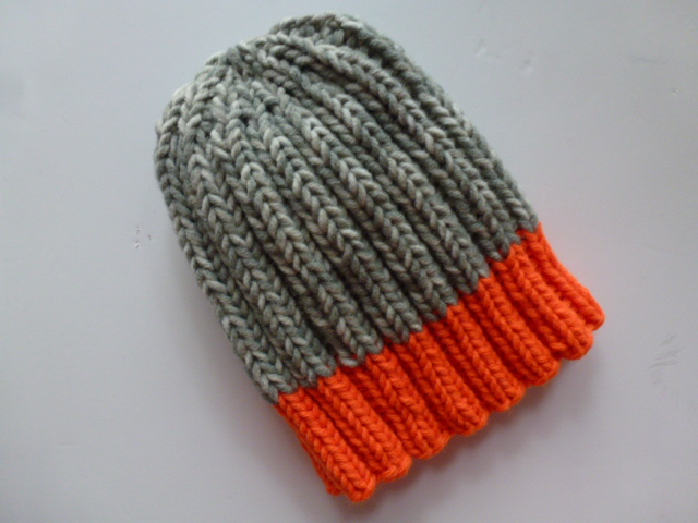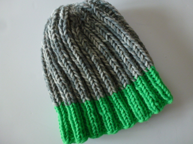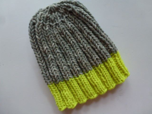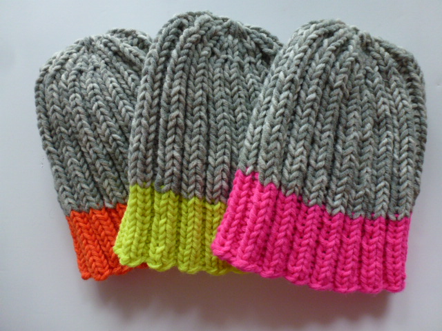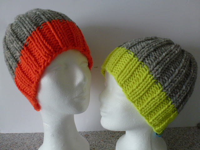 Lässige Mütze mit durchgehendem Rippenmuster in Bicolor. Ein gut sitzendes Modell das für Damen und Herren gleichermaßen geeignet ist. Sie wurde mit einem breiten neonfarbenen Bündchen und grau gemustertem Oberkopf nach eigenem Entwurf handgestrickt.