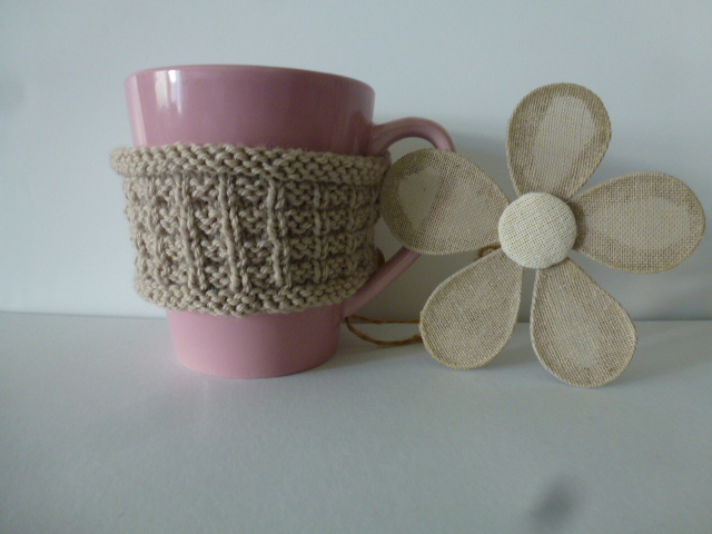 Rosa Tasse mit Strukturmuster-Tassenwärmer beige aus Wolle