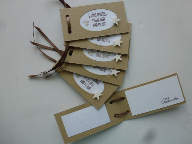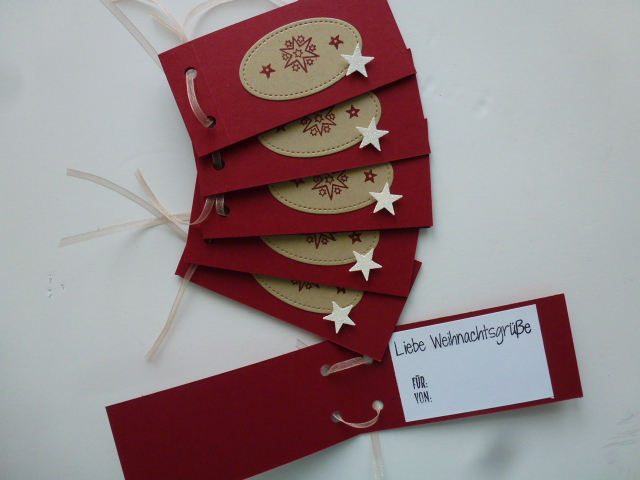 Handgefertigte Geschenkanhänger zum Aufklappen mit verschiedenen Motiven/Texten bestempelt.