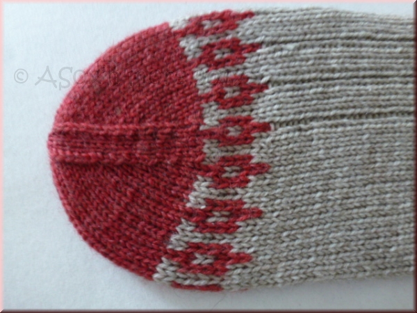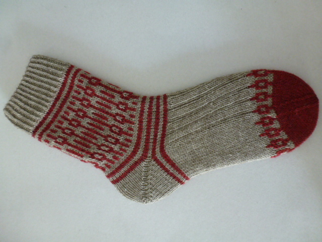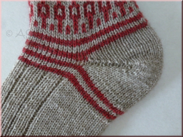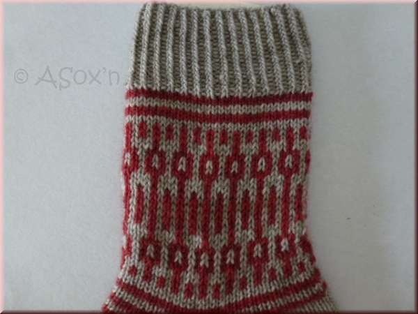 Sie benötigen ein einfarbiges Strumpfgarn als Grundfarbe, sowie ein buntes und/oder (je nach Geschmack) ein einfarbiges für die Muster. Das Jaquardmuster ist eher leichter zu stricken und bereits von einigen Strickerinnen (geübte und auch weniger geübte) getestet worden. Generell muss hier sehr auf die Fadenspannung geachtet werden. Bumerangferse und Bandspitze sind leicht zu bewältigen.
