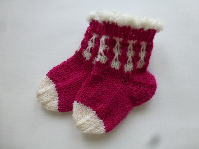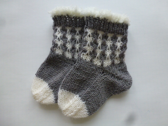 Sie benötigen zwei Knäuel einfarbiges Sockengarn (25g/50g) und einen Rest Flauschgarn - hier Lenja Soft. Das Modell wird mit Bumerangferse und Bandspitze gearbeitet. Das Muster ist ein Hebemaschenmuster und eher einfach zu stricken.