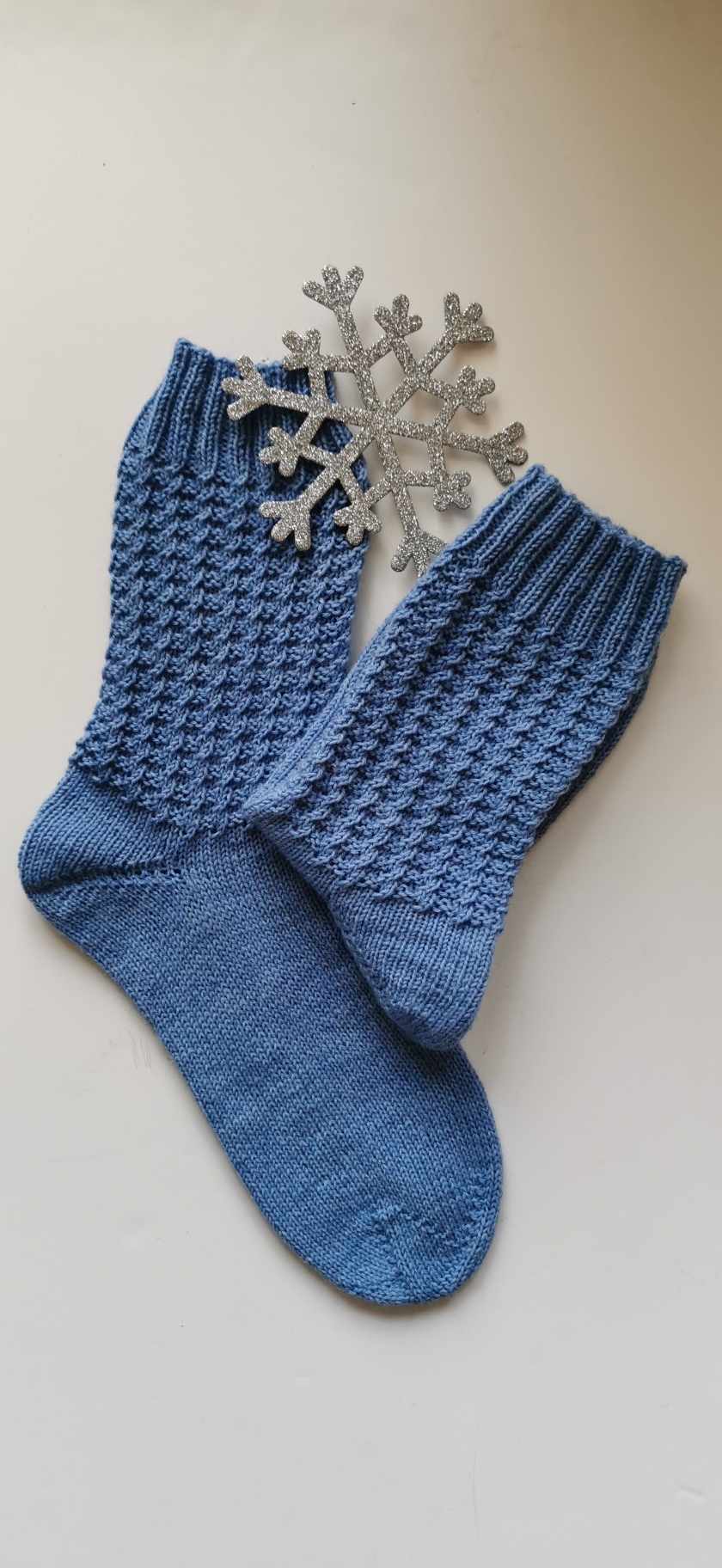 Sie benötigen ein Knäuel einfarbige oder melierte Strumpfwolle (100g reichen aus bis Gr. 45). Das Strukturmuster ist nicht zu schwierig und geht schon nach wenigen Runden gut von der Hand. Bumerangferse und Schleudersternspitze sind ebenfalls gut zu bewältigen. Auch für Stricker/Innen geeignet, die nicht regelmäßig Socken auf den Nadeln haben.
