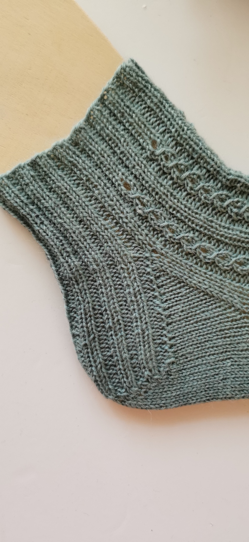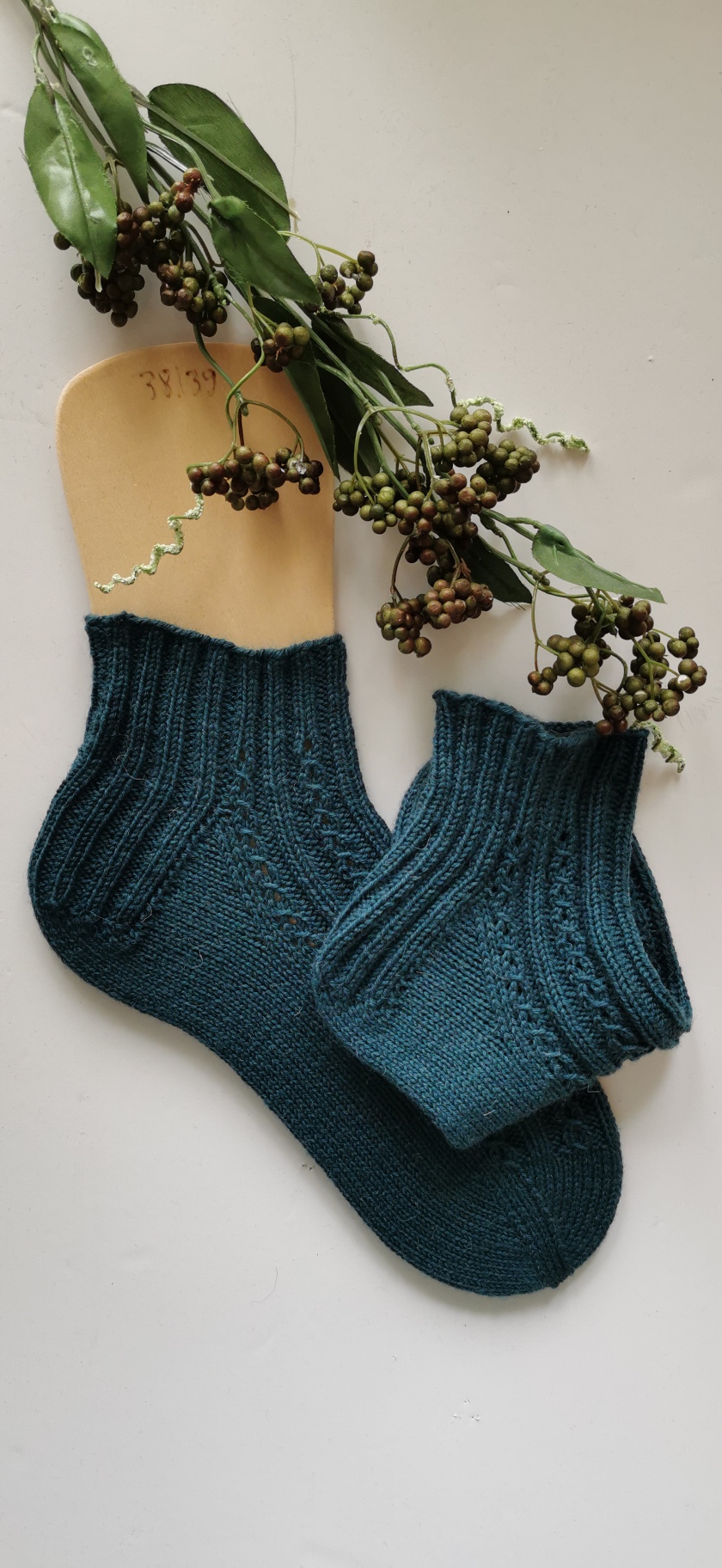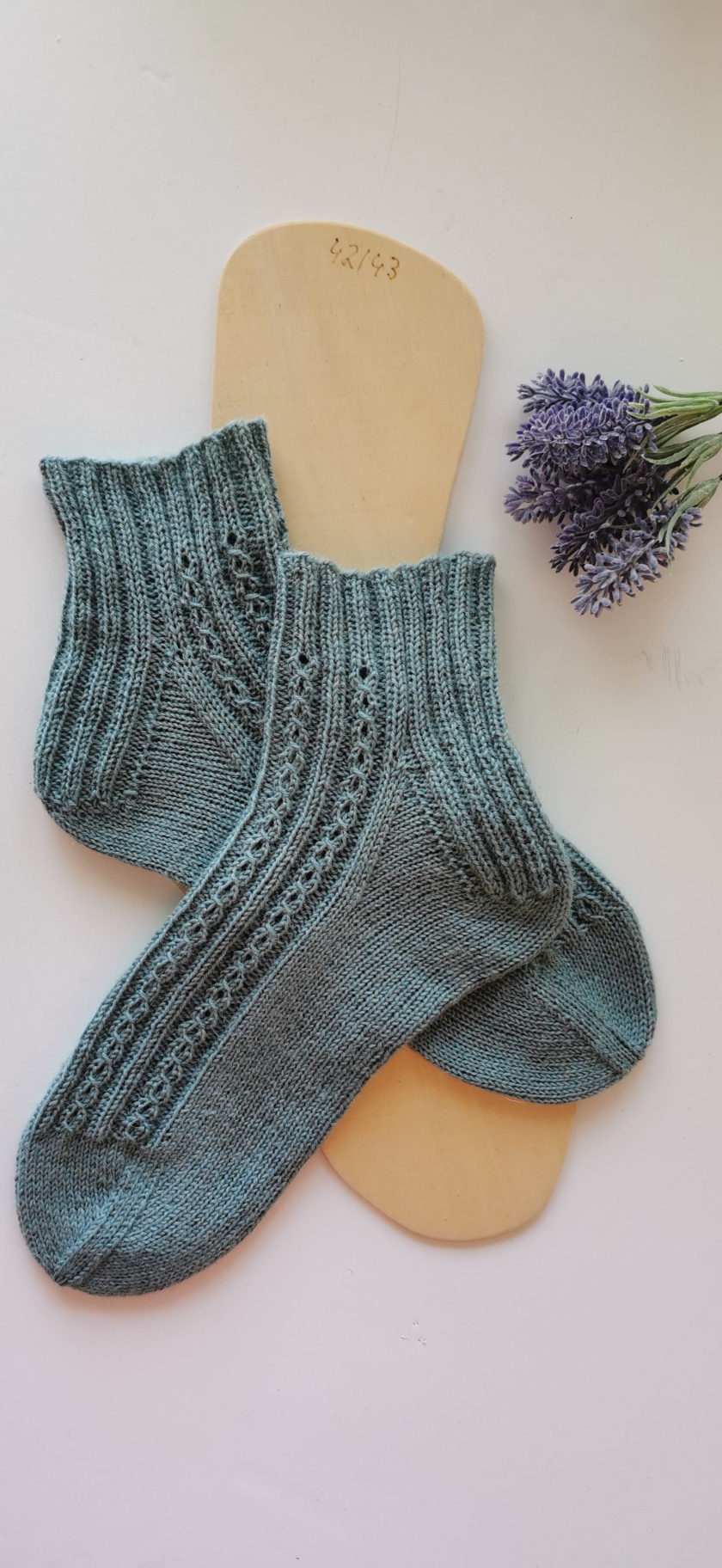 Sie benötigen ein Knäuel einfarbige oder melierte Strumpfwolle (Verbrauch je nach eigener Strickfestigkeit ca. 55g für Gr. 38/39 und ca. 60g für Gr. 42/43). Das Strukturmuster ist nicht zu schwierig und geht schon nach wenigen Runden gut von der Hand. Herzchenferse und Bandspitze sind ebenfalls gut zu bewältigen (jeweilige Grundanleitungen sind in der Beschreibung enthalten). Auch für Stricker/Innen geeignet, die nicht regelmäßig Socken auf den Nadeln haben.