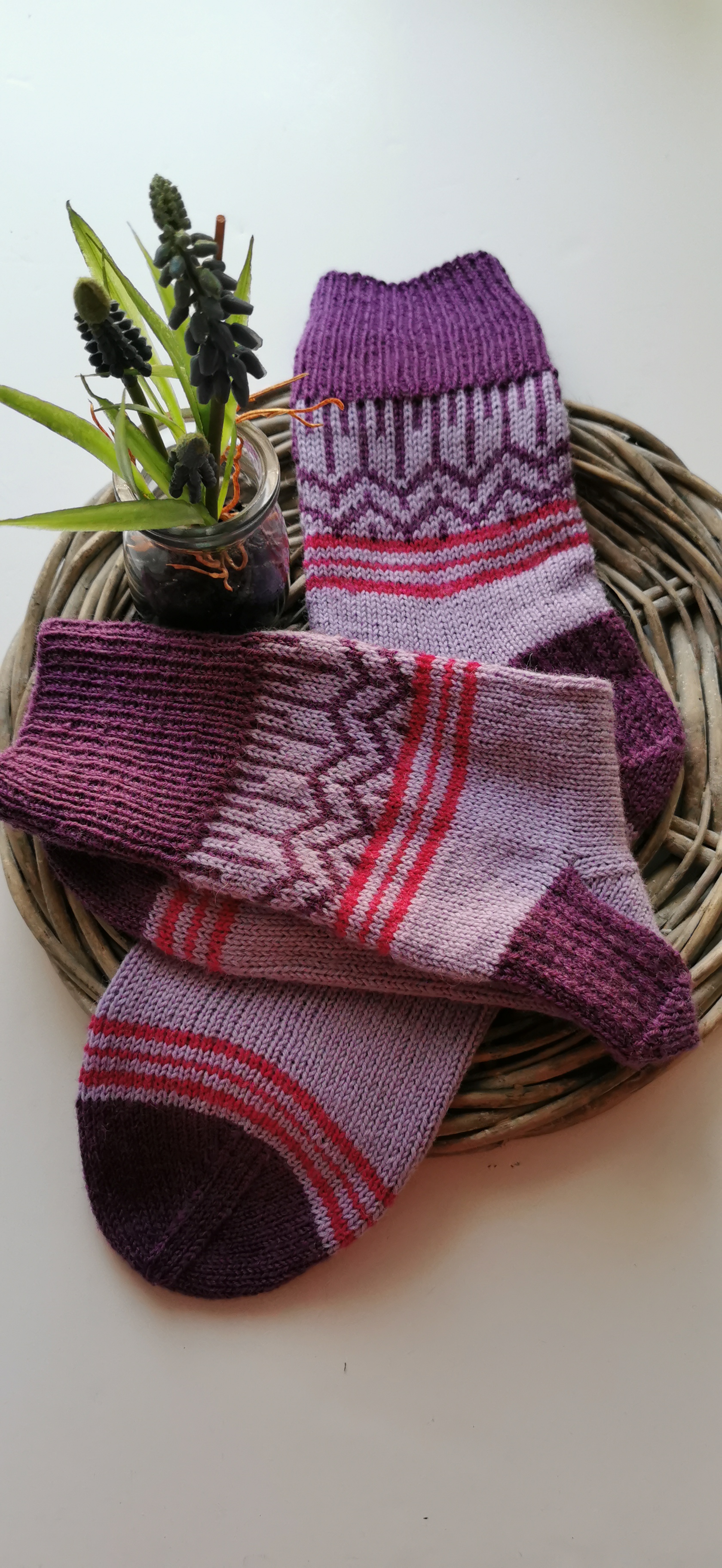 Sie benötigen einfarbige oder melierte Strumpfwolle in zwei Farben und zusätzlich einen unifarbenen Rest in Kontrastfarbe. Das Einstrickmuster ist nicht zu schwierig und geht mithilfe des Zählmusters nach wenigen Runden gut von der Hand. Es entstehen auf der Rückseite nur kurze Spannfäden, da maximal 3 Maschen überbrückt werden müssen. Herzchenferse und Bandspitze sind ebenfalls gut zu bewältigen (jeweilige Grundanleitungen sind in der Beschreibung enthalten). Auch für Stricker/Innen geeignet, die nicht regelmäßig Socken auf den Nadeln haben.