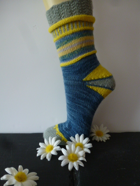 Für dieses Modell benötigen sie je ca. 50g eines einfarbigen Grundtons und farblich abgestimmtes Colorgarn, sowie je einen Rest von zwei passenden oder kontrastierenden Unis für Ferse, Spitze und Bündchen. Die Strümpfe wurden mit doppeltem Bündchen, 2/3-Ferse und Bandspitze gearbeitet