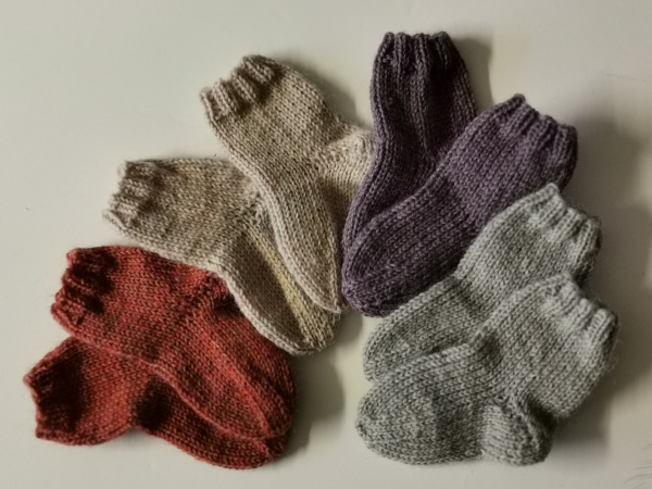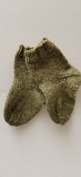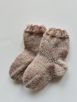 Schlichte Söckchen mit ca 1,5cm breitem Bündchen aus feinem Melange-Garn. Die Socken wurden aus einem effektvollen Shiné-Garn gefertigt und glatt rechts gestrickt. Auf diese Weise wirkt das Material ganz besonders gut. Zeitloses, nach eigenem Entwurf handgestricktes Modell für Jungs und Mädels.