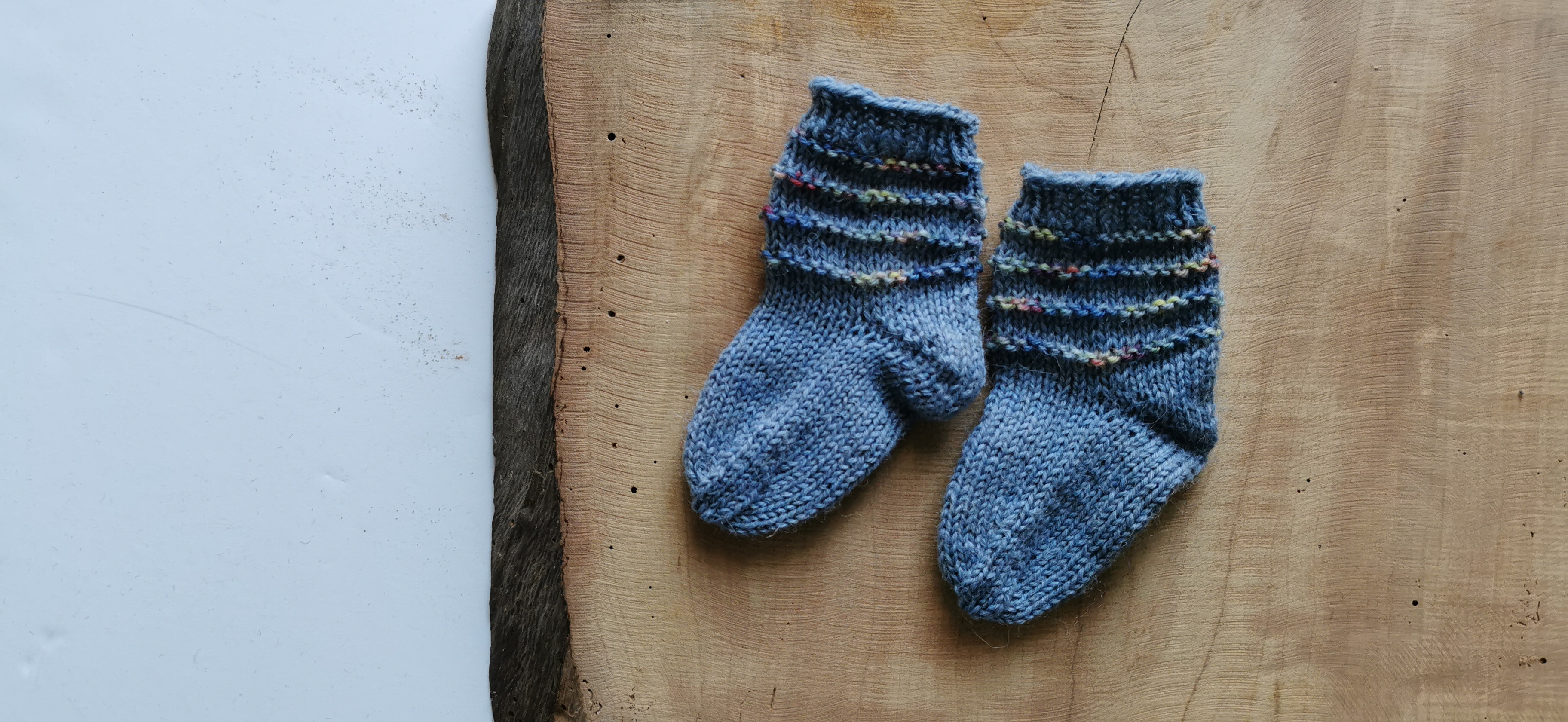 Schlichte Söckchen mit ca 1cm breitem Bündchen und Mini-Rollrand. Die Socken wurden aus einem unifarbenen Garn gestrickt und am Schaft mit einem Struktur-Ringelmuster aus Colorgarn versehen. Das Modell wurde mit Bumerangferse und Bandspitze gestrickt. Zeitloses, nach eigenem Entwurf handgestricktes Modell für Jungs und Mädels.