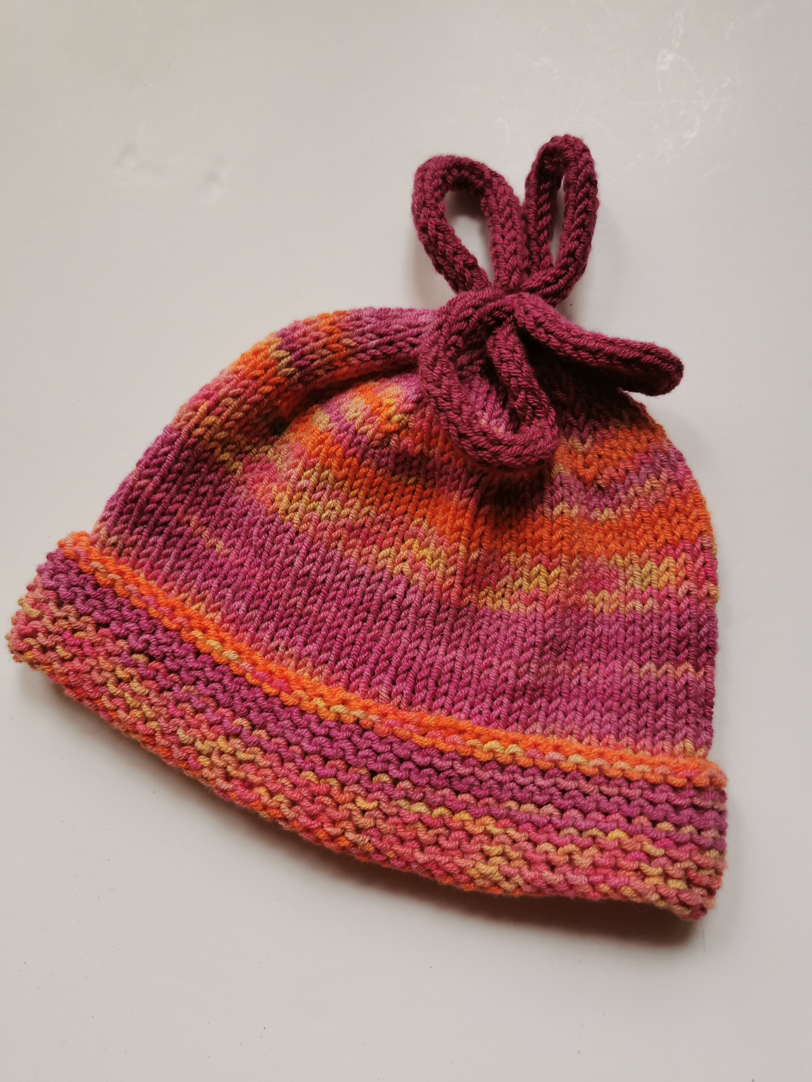 Schickes Modell für kleine Ladies. Für diese handgestrickte Mütze mit Umschlag wurde ein weiches, Color-Baumwollgarn verwendet.