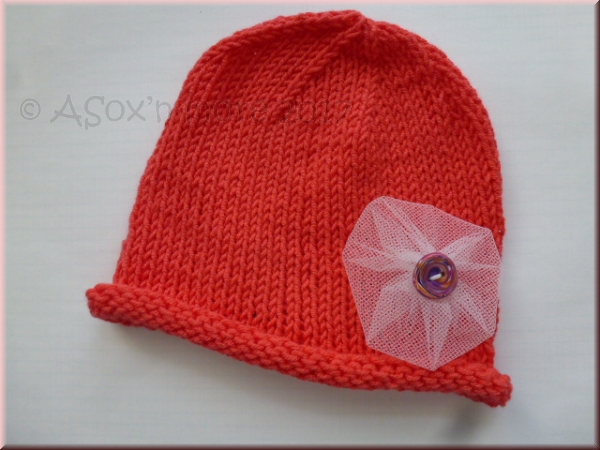 Schlichtes Modell für kleine Ladies. Für diese handgestrickte Mütze mit kleinem Rollrand wurde ein weiches, lachsfarbenes Baumwollgarn verwendet.