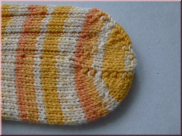 Das Muster ergibt sich aus dem Farbverlauf des verwendeten Garnes und kann nicht beeinflusst werden. Auch wenn ich mir sehr große Mühe gebe kann es vorkommen, dass die beiden Socken eines Paares nicht 100% identisch sind. Dies ist kein Grund zur Beanstandung. Sie erhalten bei mir nur handgefertigte Einzelstücke, keine maschinell hergestellte Massenware.