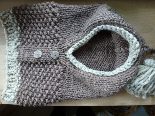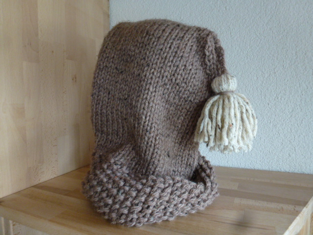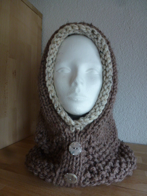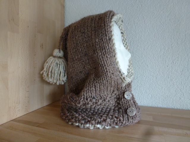 Ausgefallene Hoody-Mütze mit Quaste. Diese Mütze wurde aus einem extra dicken (chunky) Material nach eigenem Entwurf handgestrickt. Sie vereint Loop und Kapuze in einem Teil und ist daher sehr praktisch und schön kuschelig warm. Die Mütze ist aus dickem, braunem Tweed gestrickt. Als Kontrast dazu wurden Bündchen, Kapuzenrand und Quaste aus naturfarbenem Tweed gearbeitet. Die Front zieren zwei farblich abgestimmte Knöpfe. Eine ganz besonderes Modell das seinesgleichen sucht.