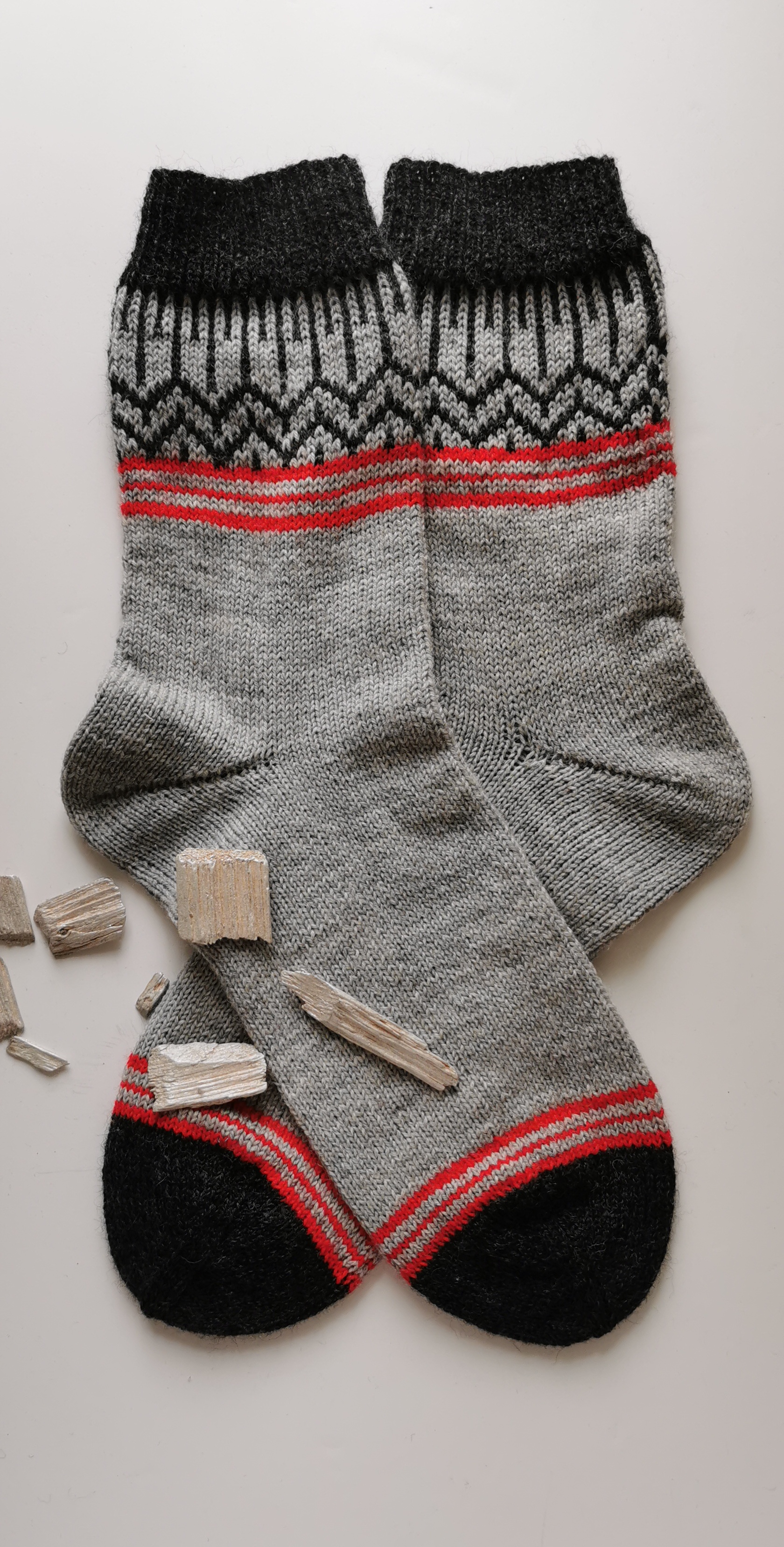 Herrensocke mit hübschem Jaquardmuster. Diese Socke hat ein ca. 4cm breites, unifarbenes Rippbündchen das am Schaft in ein dezentes Muster in Jaquardtechnik übergeht. Der Übergang vom Muster zum einfarbigen Teil der Socke wird durch ein schmales Ringelmuster in Kontrastfarbe betont. Das Rot des Ringelmusters scheint auf den melierten Grau-/Anthrazittönen ganz besonders zu leuchten und wiederholt sich noch einmal vor Beginn der Spitze..Das Modell wurde nach eigenem Entwurf angefertigt und mit Bumerangferse und Bandspitze (in Bündchenfarbe) versehen. Ein Modell in klassischer Form mit dem gewissen Extra.