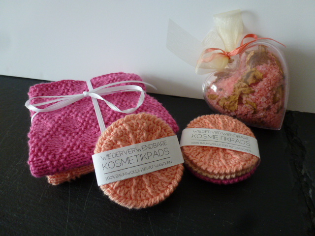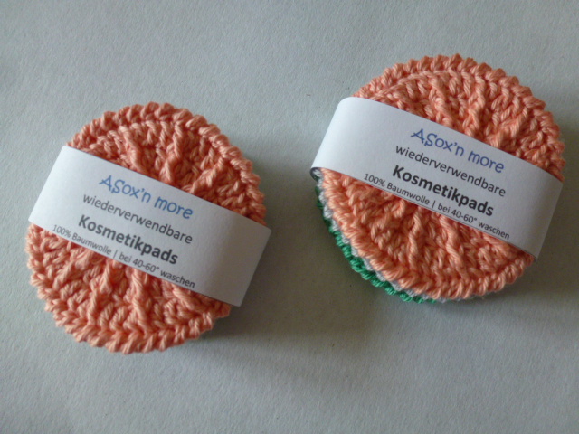 Nachhaltigkeit geht uns alle an! Daher biete ich in meinem Shop auch diese hübschen, handgearbeiteten Kosmetikpads aus Baumwolle an. Das Strukturmuster sorgt für Griffigkeit und guten Reinigungseffekt mit leichter Massagewirkung. Die Pads sind doppelt gearbeitet und haben eine strukturierte und eine etwas glattere Seite. Sie sind geeignet zum Abschminken und Reinigen des Gesichts ohne dabe zu fusseln, wie es Einweg-Wattepads schon mal gerne tun. Zum Waschen in der Waschmaschine sollten Sie in ein Wäschesäckchen gegeben werden und können so bei 40-60°C problemlos gewaschen werden (mit gleichen Farben waschen, da dunklere Farbtöne am Anfang etwas ausbluten können. Bei den ersten Wäschen bevorzugt mit 60°C waschen, da zu niedrige Temperaturen das Ausbluten begünstigen können)