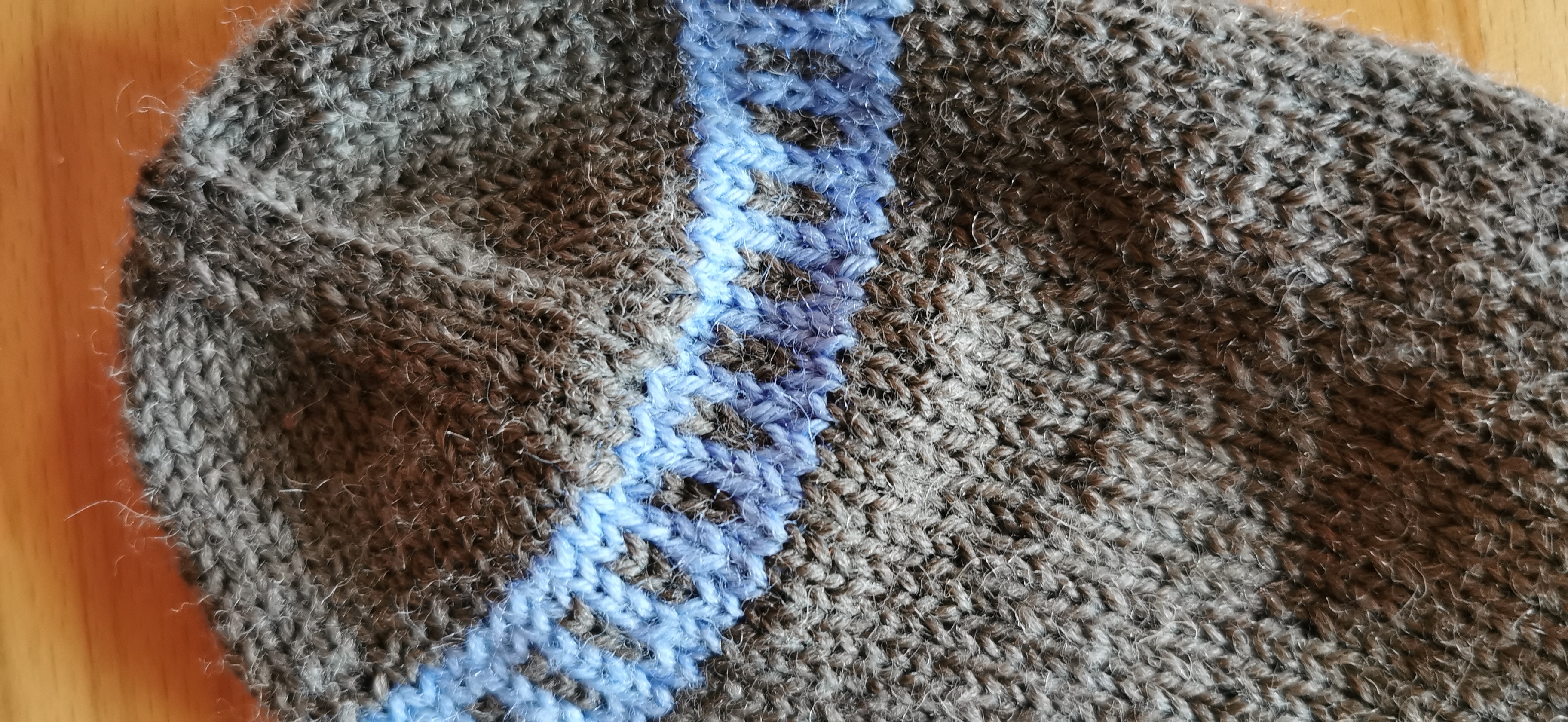 Kurze Socke mit kleinem graphischen Muster. Das Modell hat ein ca.2,5cm breites, geripptes Bündchen. Am kurzen Schaft der glatt gestrickten Socke wurde eine ca. 2,5cm breite Musterbordüre in Kontrastfarbe eingearbeitet. Eine passende, ca. 1,5cm breite Bordüre befindet sich am Übergang vom Fuß zur Spitze. Das Modell wurde mit Bumerangferse und Bandspitze gearbeitet und ist ein Einzelstück.