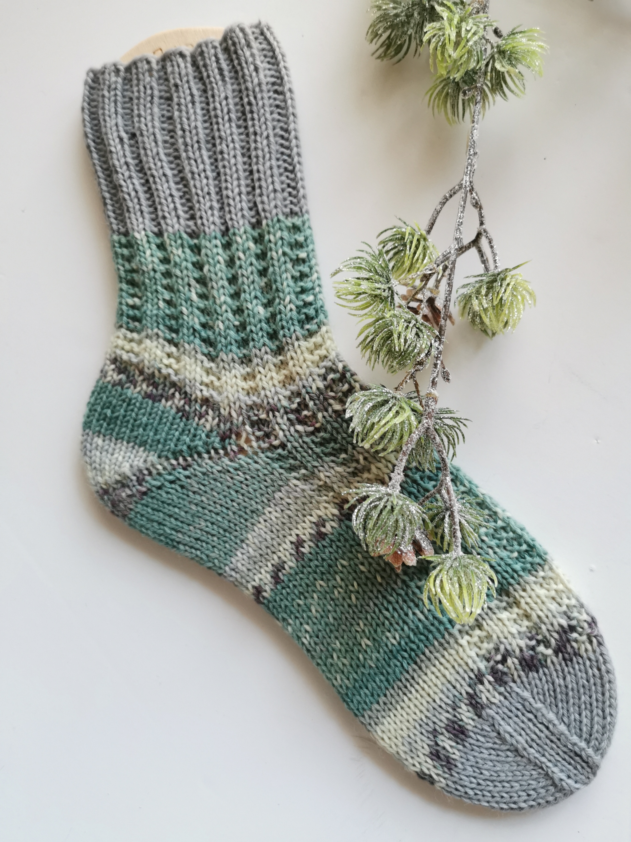 Kuschelige, warme Socke aus 6-fädigem Strumpfgarn in einem Farbenmix aus Grau- und Grüntönen. Dieses Modell wurde mit einem hellgrauenen, ca. 7,5cm breiten, umschlagbaren Bündchen versehen. Schaft und Fuß, gestrickt aus einem selbstmusternden Garn, sind mit einem dezenten Rippenmuster gearbeitet, Die Spitze wurde wiederum in Bündchenfarbe gestaltet. Tolle warme Kuschelsocken als Hausschuhersatz oder einfach zum Wohlfühlen.