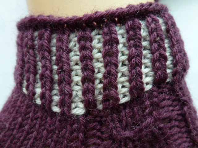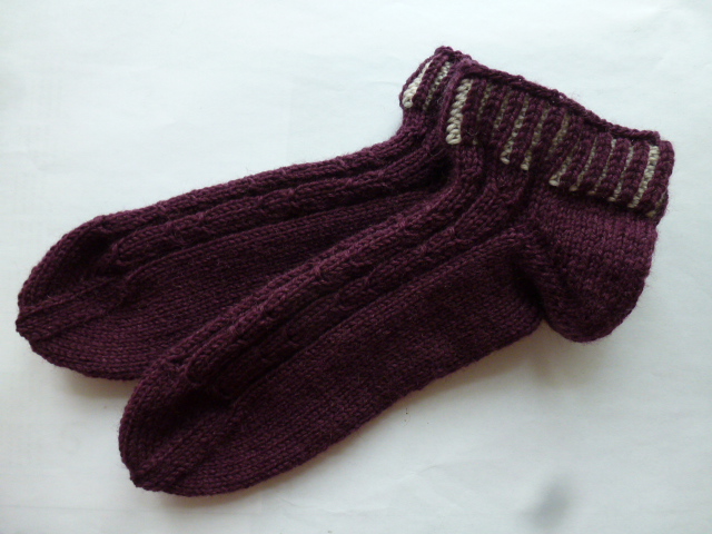 Kuschelige, handgestrickte Sneakersocken aus 6-fädigem Strumpfgarn in bordeaux mit Akzenten in leinen-meliert. Die Socken haben ein zweifarbiges, ca. 3,5cm breites, angenehm weiches Bündchen und sind auf der Vorderseite mit einem flachen Zopfmuster versehen.