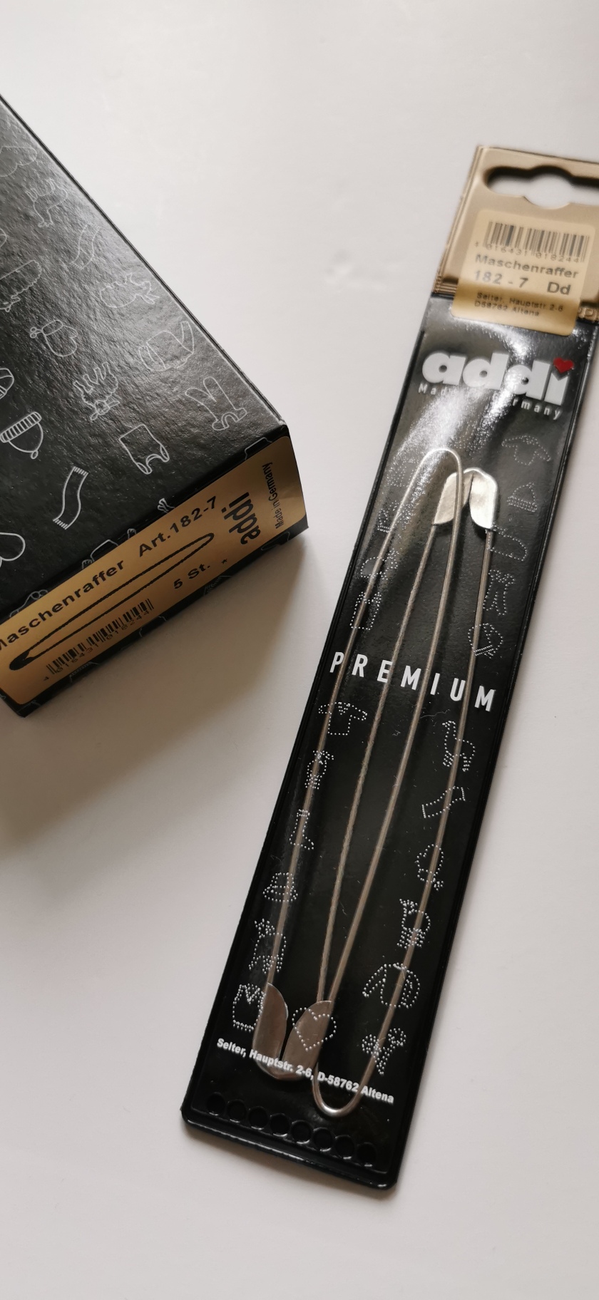Diese übergroßen Sicherheitsnadeln dienen zum Stilllegen von Maschen. Die praktischen Helfer beim Stricken.