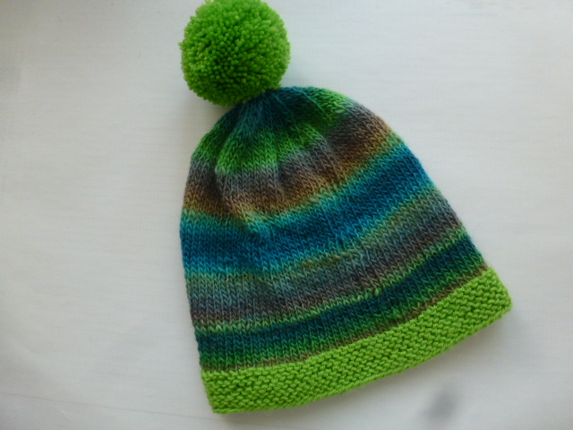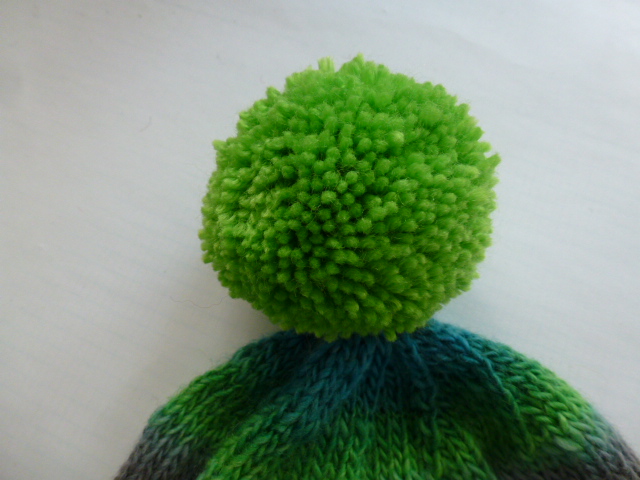 Klassische Bommelmütze aus edlem Garn. Für diese Ringelmütze mit tollem Farbverlauf in Grüntönen wurde ein sehr leichtes, weiches Merinogarn verwendet. Das schmale Bündchen und die Bommel wurden in einem farblich harmonierenden apfelgrün gearbeitet.
