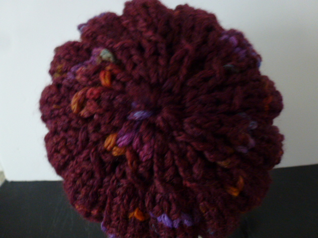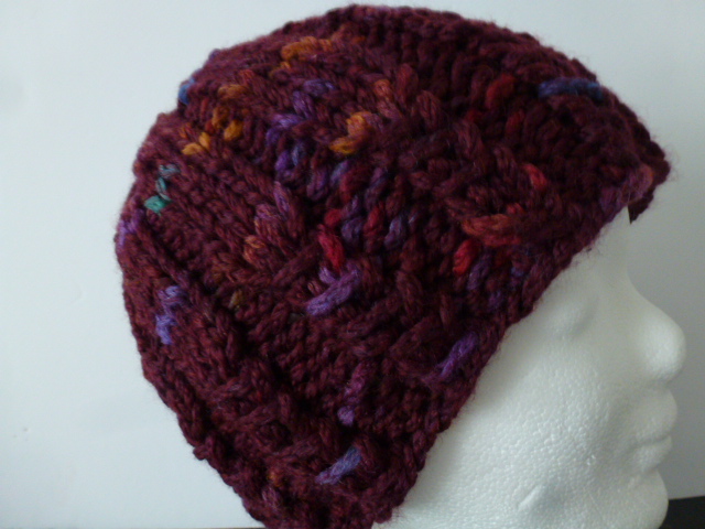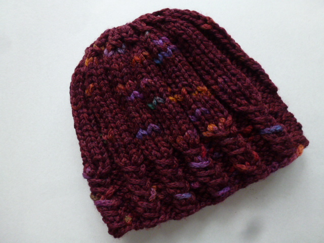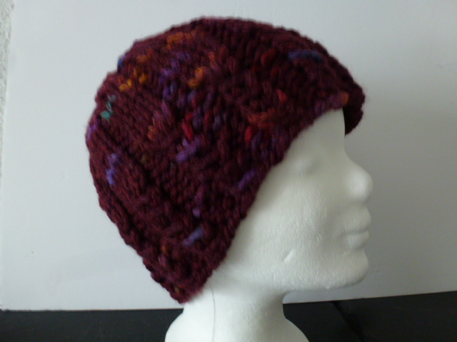 Dicke, handgestrickte Mütze mit raffiniertem Bündchen. Das Modell wurde mit einem ca. 6cm breiten Bündchen mit angedeutetem Zopfmuster versehen. Der Übergang zum oberen, gerippten Mützenteil ist fließend, Die Struktur und die Farbgebung des verwendeten Garnes geben der Mütze einen individuellen Touch.