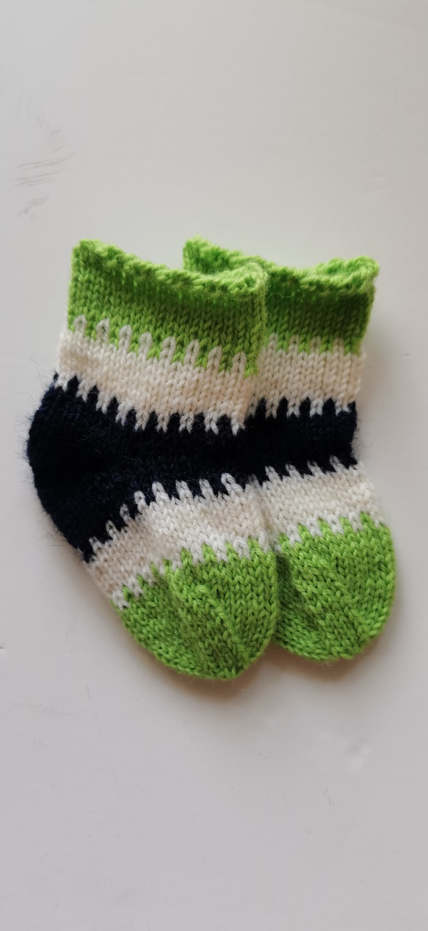 Babysöckchen im Colorblockinglook. Anstelle eines klassischen Bündchens wurde hier ein dekorativer Drehrand gearbeitet. Oberer Schaftteil und Spitze wurden jeweils in derselben Farbe gearbeitet, die Ferse marineblau und die Zwischenstücke jeweils weiß gestrickt. Die Übergänge wurden in einem kleinen Zackenmuster gestaltet. Süße Söckchen, für alle, die es etwas auffälliger mögen.