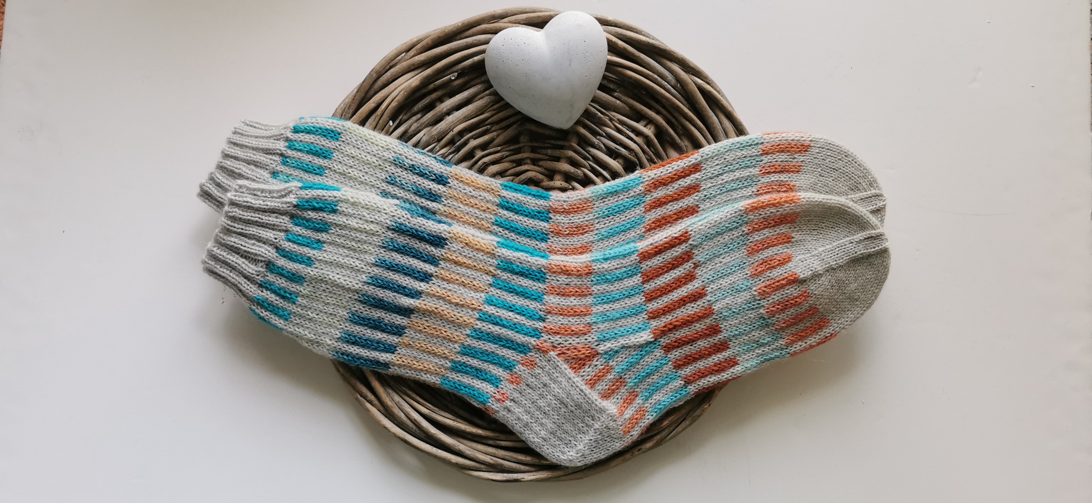 Neues Sockenmodell gestrickt aus einem Mix aus einfarbigem und Colorgarn. Das ca. 3cm breite, unifarbene Bündchen geht am Schaft in ein hübsches Streifen-/Ringelmuster über. Das Muster setzt sich am Fuß fort, die Herzchenferse und Bandspitze wurden, wie das Bündchen, einfarbig gearbeitet. Klassisches Modell mit pfiffiger Farb- und Mustergestaltung. Sie erhalten ein handgestricktes Unikat!