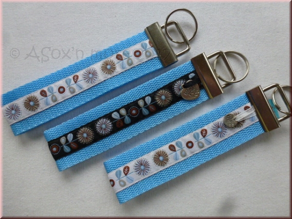 Schlüsselanhänger aus Gurtband, dekoriert incl. Schlüsselring. Auf die Gurtbänder wurden farblich harmonierende Dekorbänder aufgenäht. Teilweise wurden passende Miniaturanhänger an dünnen Kordeln oder Bändern befestigt. Auch praktisch als Taschen oder Kofferanhänger mit "Wiedererkennungseffekt".