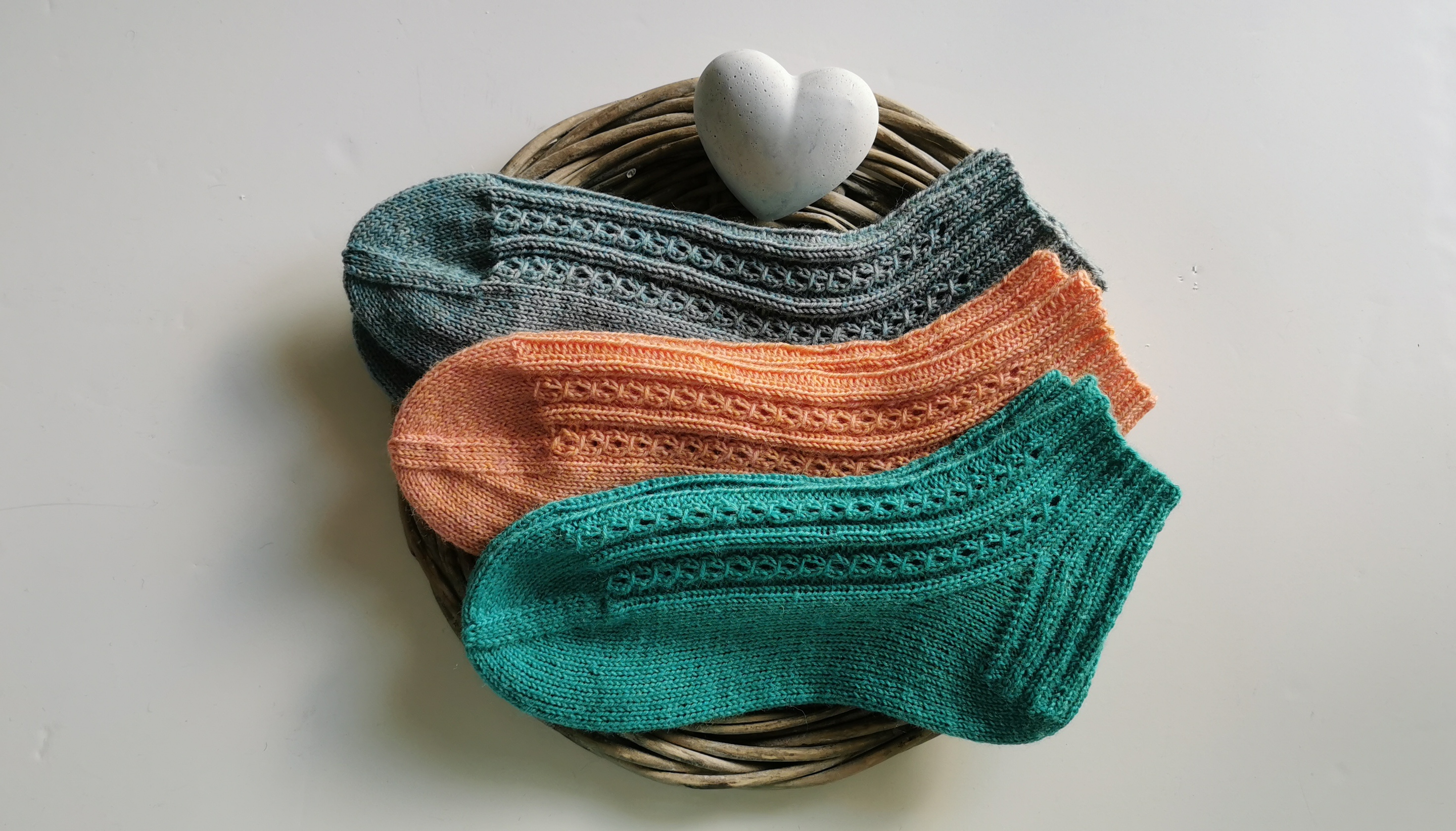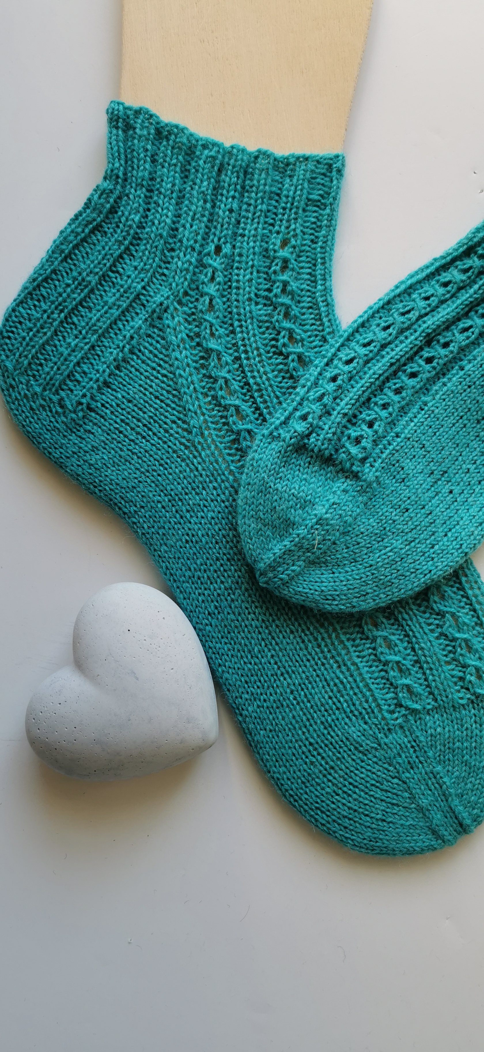 Hübsche, handgestrickte Sneakersocke aus 4-fädigem Strumpfgarn. Die Socken haben ein 2/2er Bündchen, das am vorderen Teil des sehr kurzen Schaftes in ein kombiniertes Rippen-/Wabenmuster übergeht. Der hintere Teil, einschließlich der Fersenwand, wurde weiter im Rippenmuster bis zur Fersenkappe gestrickt. Bei diesem Modell wurde eine Herzchenferse mit Spickel und Bandspitze eingearbeitet.