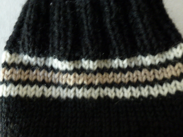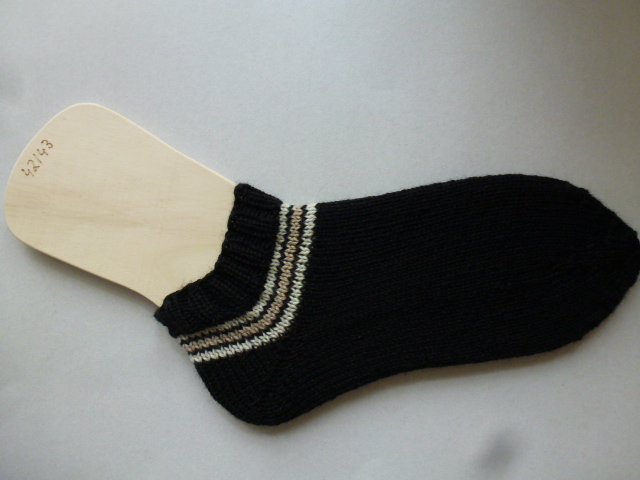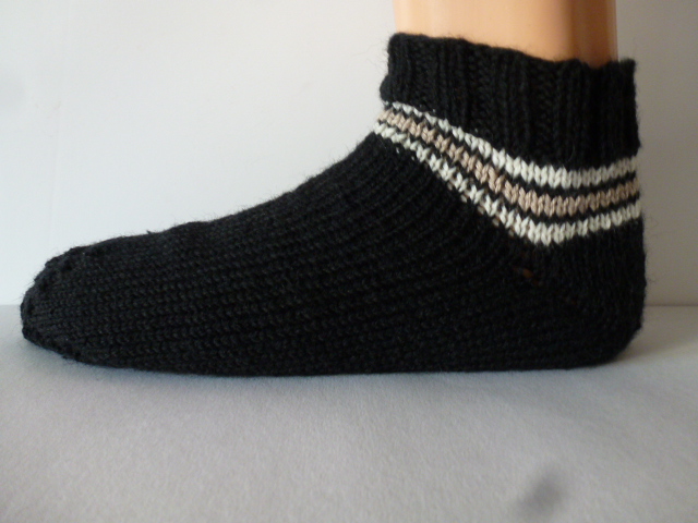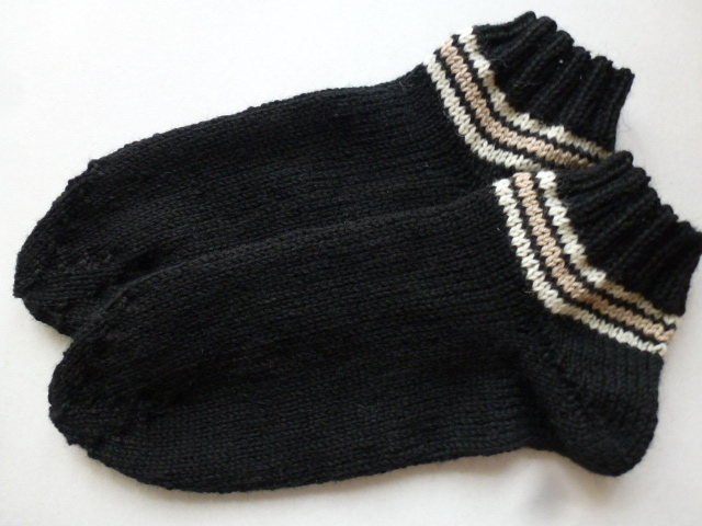 Warme, handgestrickte Sneakersocken aus 6-fädigem Strumpfgarn in schwarz mit naturfarbenen Akzenten. Die Socken haben ein ca.3cm breites, geripptes Bündchen und sind am kurzen Schaft, mit einem dezenten Ringelmuster versehen. Sie sind glatt gestrickt und haben eine dekorative Spitzenlösung, die für nahezu jeden Fuß passt. Ein schlichtes Modell für Sneakerfans, auch als Hausschuhersatz geeignet.