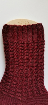 Dieses Unisex-Modell wurde mit einem ca. 4cm breiten, gerippten Bündchen versehen. Ein kleines Rosenzöpfchenmuster am Schaft wertet diese Socken optisch auf. Der Fuß ist glatt gestrickt und mit Bumerangferse und Schleudersternspitze versehen. Ein schickes Modell, das perfekt zum Freizeitlook passt. Die Socke wurde nach eigenem Entwurf handgestrickt