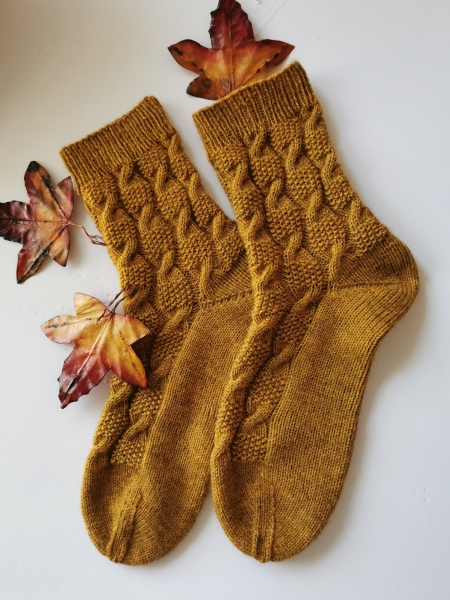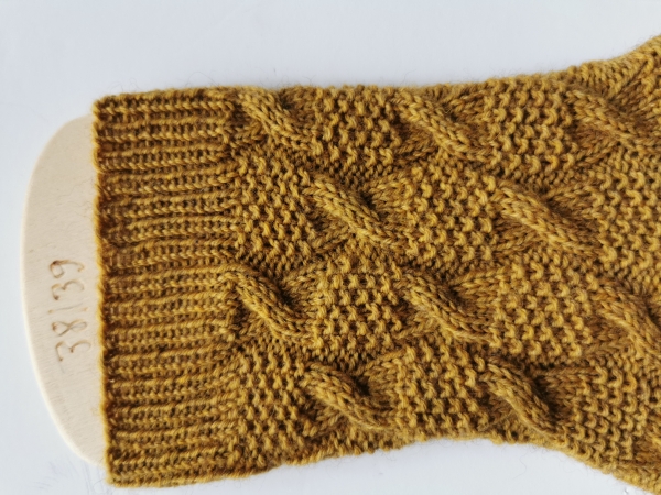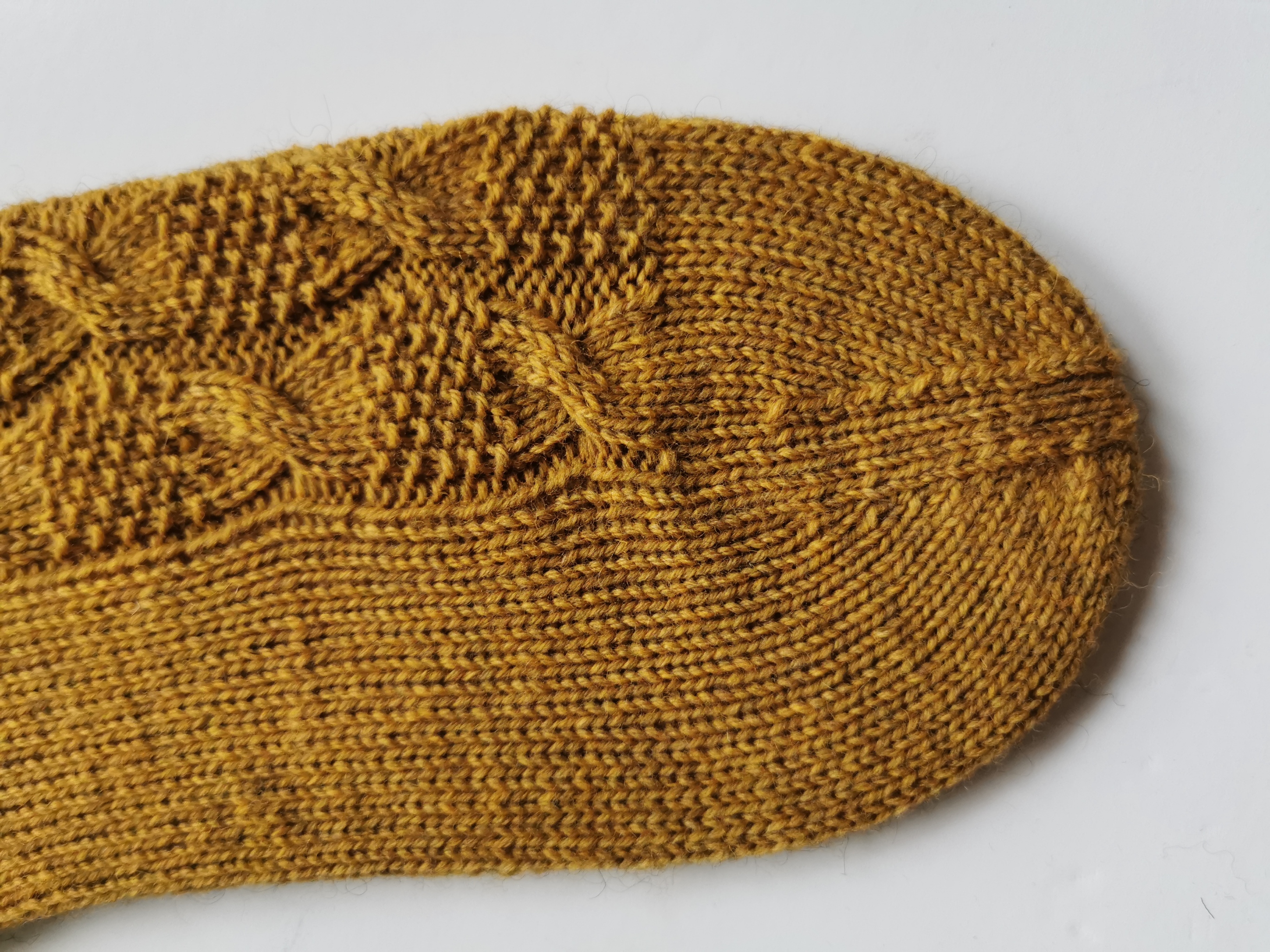 Schicke Socke mit kombinierem Zopf-/Strukturmuster aus edlen Garnen. Ein ca. 3cm breites, schmal geripptes Bündchen sorgt für guten Halt. An Schaft und Oberfuß wurde ein hübsches Muster eingearbeitet. Die gut sitzende Bumerangferse und die Sohle sind glatt gestrickt. Sie erhalten ein wunderbar weiches Sockenpaar aus feiner Merino-Mischung.