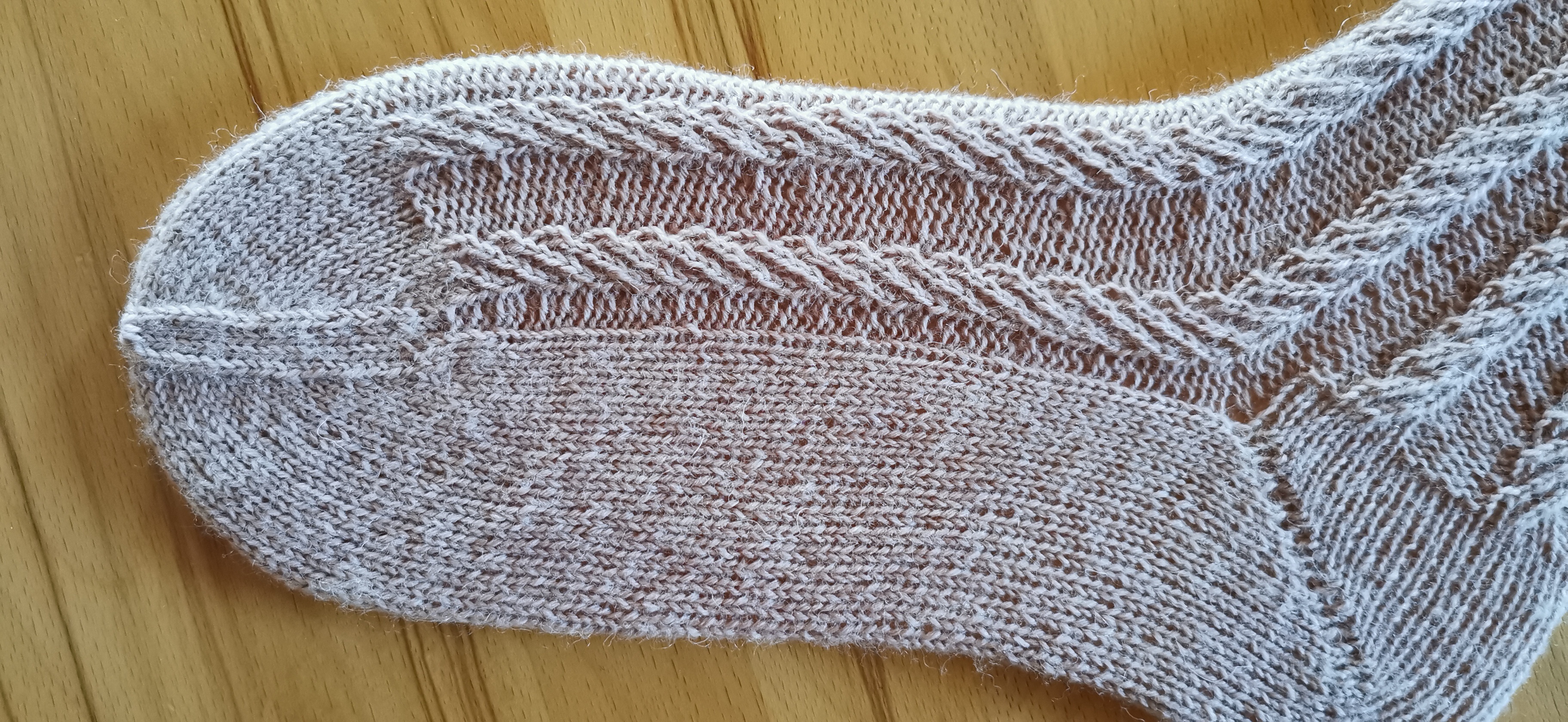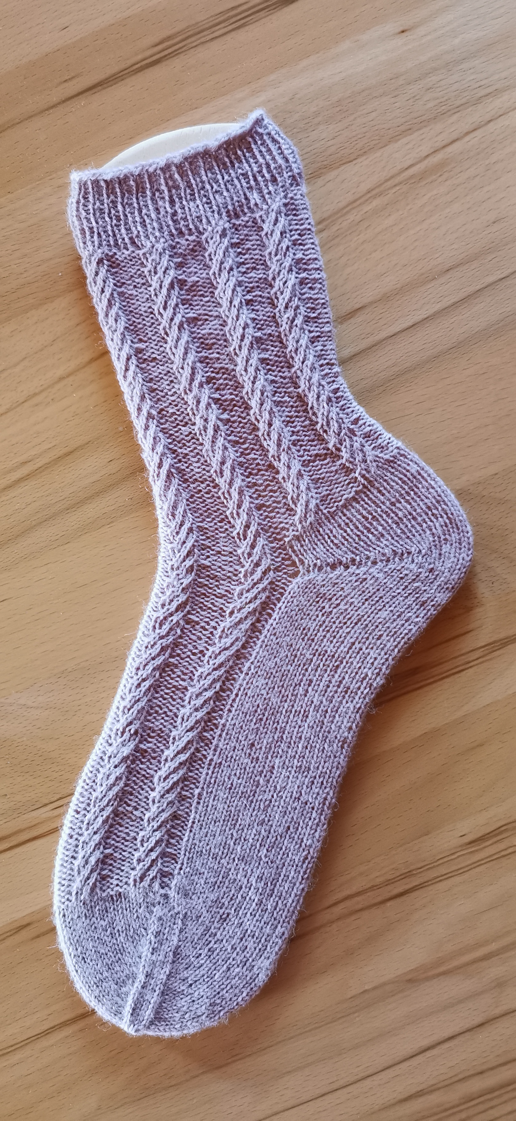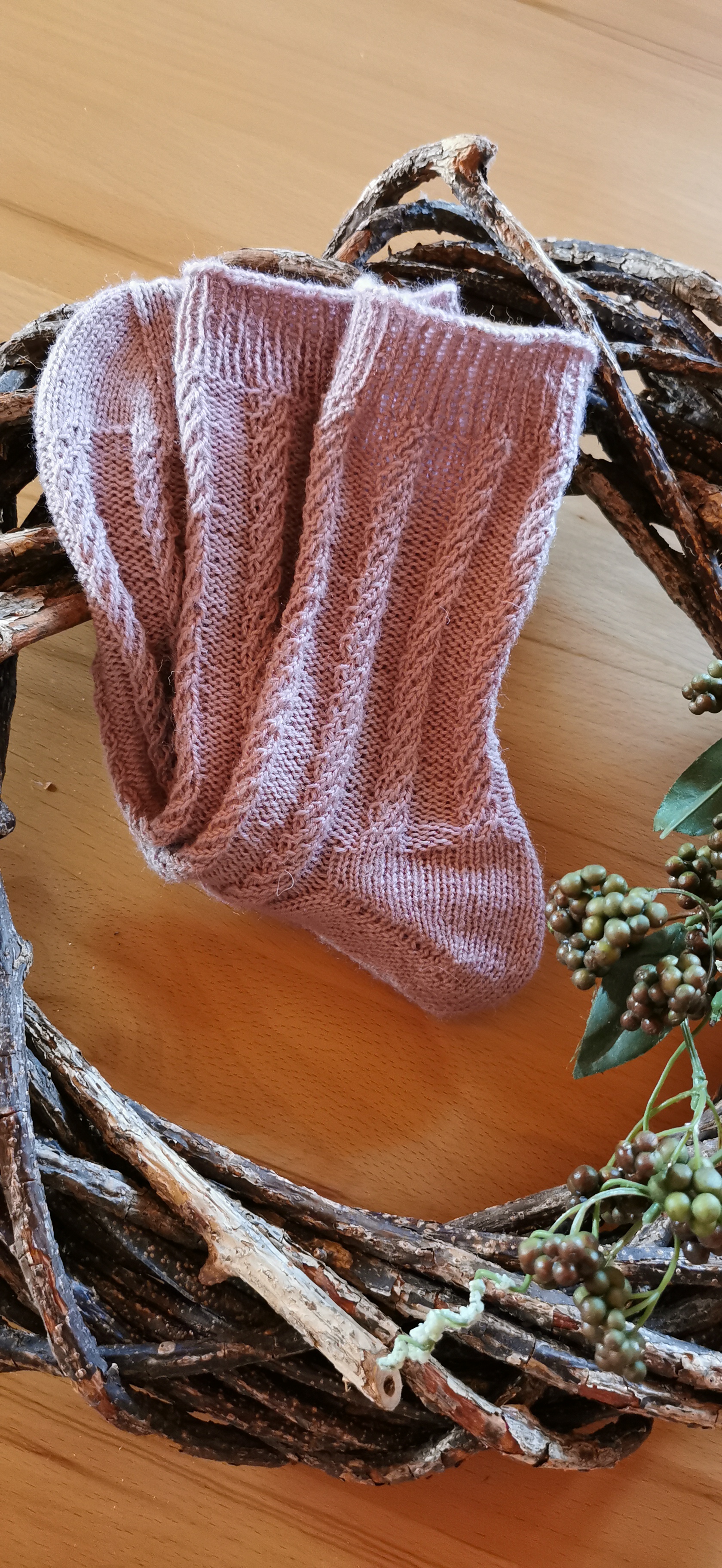 Hübsche Socke aus klassischer Strumpfwolle in der Trendfarbe dusty pink. Ein ca. 3cm breites Bündchen sorgt für guten Sitz und geht am Schaft in ein Struktur-Rippenmuster über. Das Muster verläuft weiter über den Fußrücken während die Sohle glatt gearbeitet ist. Da das Muster lediglich aus rechten und linken Maschen besteht, trägt es nicht auf und die Socken sind durchaus gut im Schuh tragbar. Das Modell wurde mit Bumerangferse und Bandspitze gearbeitet.