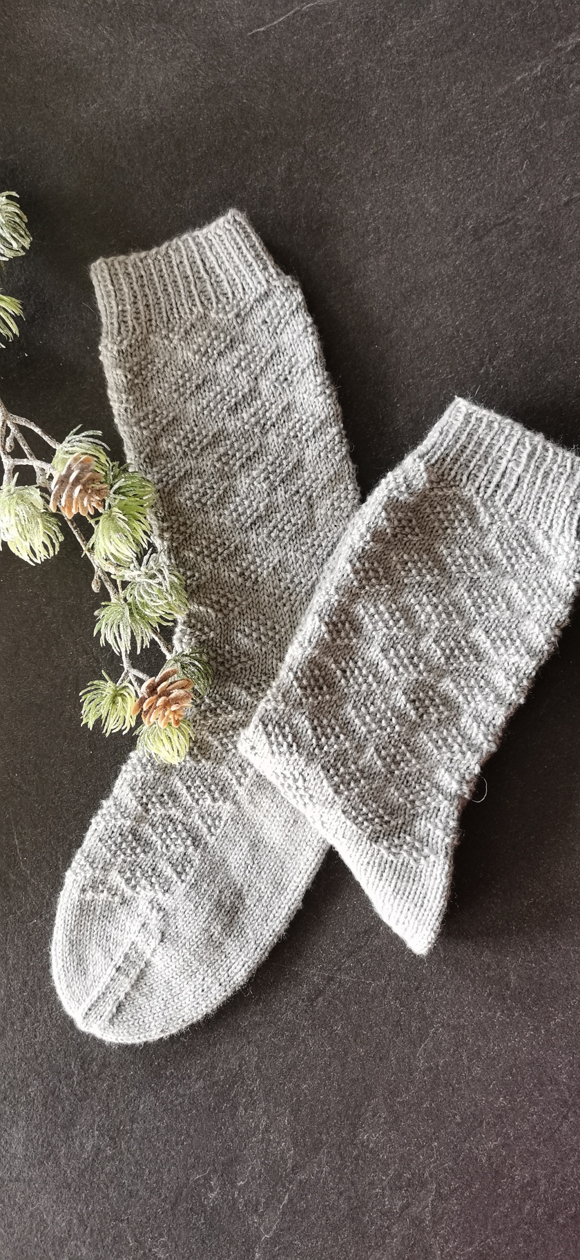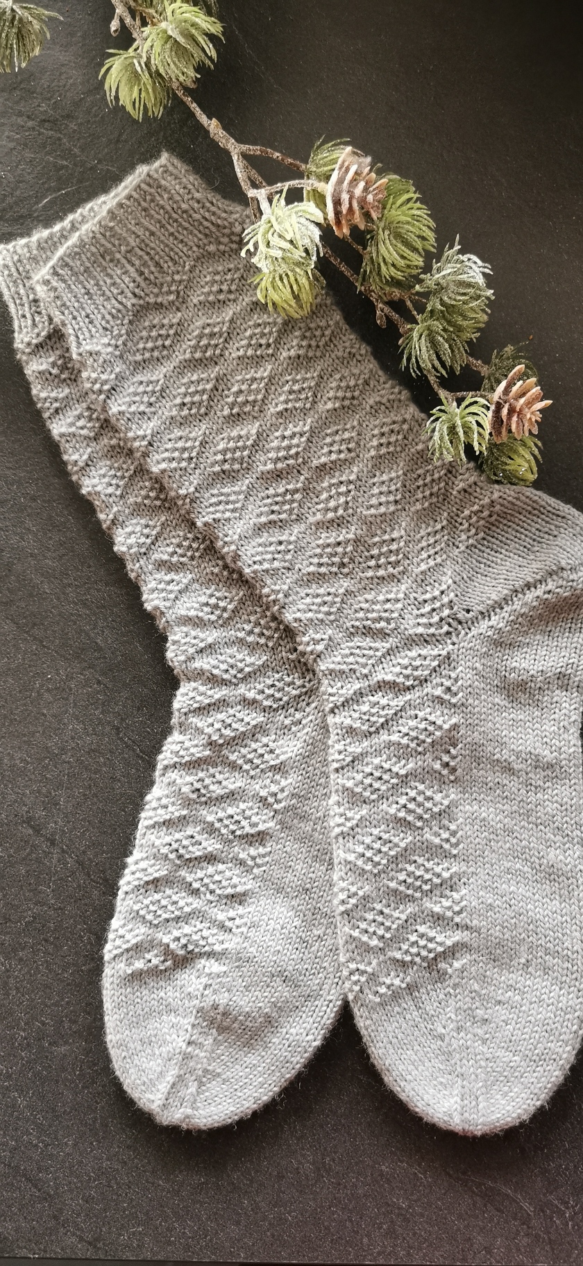 Sehr edle Socke aus Strumpfwolle mit Seidenanteil. Ein ca. 3cm breites, schmal geripptes Bündchen sorgt für guten Halt. An Schaft und Oberfuß wurde ein hübsches Rautenmuster eingearbeitet. Die gut sitzende Bumerangferse und die Sohle sind glatt gestrickt. Der dezente, seidige Glanz und die Haptik dieses Sockenpaares wird sie begeistern. Eine Empfehlung für Kunden, mit empfindlicher Haut, denen die Standard-Sockenwolle nicht weich genug ist.