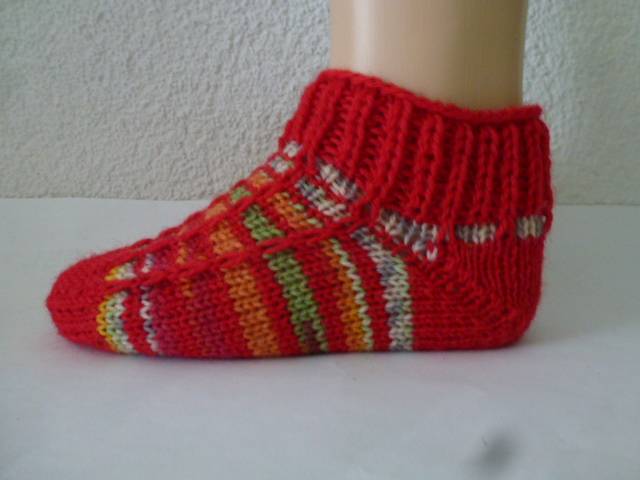 Warme rote Sneakersocken mit kunterbuntem Ringelmuster. Das ca. 4cm breite Bündchen ist angenehm weich und geht gleich in das Ringelmuster mit einigen Hebemaschen über. Die Sohle ist glatt gearbeitet. Toll als Hausschuhersatz oder z.B. für warme Füße in Gummistiefeln beim Kindergartenausflug.