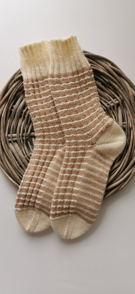 Sehr schickes Modell mit geripptem Bündchen und feinem Ringel-/Strukturmuster. Die Socke hat ein ca. 6cm breites Rippbündchen, das für guten Sitz sorgt und bei Bedarf umgeschlagen werden kann. Schaft und Oberfuß sind mit einem Strukturmuster versehen, während die Sohle glatt gestrickt ist. Das Modell ist mit Bumerangferse und Bandspitze gearbeitet. Durch die dezente Farbgebung und die klassiche Form ist das Modell zetlos und fast zu allem tragbar.