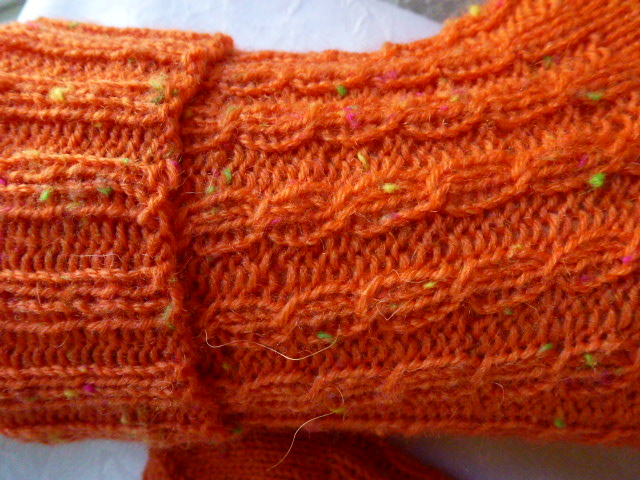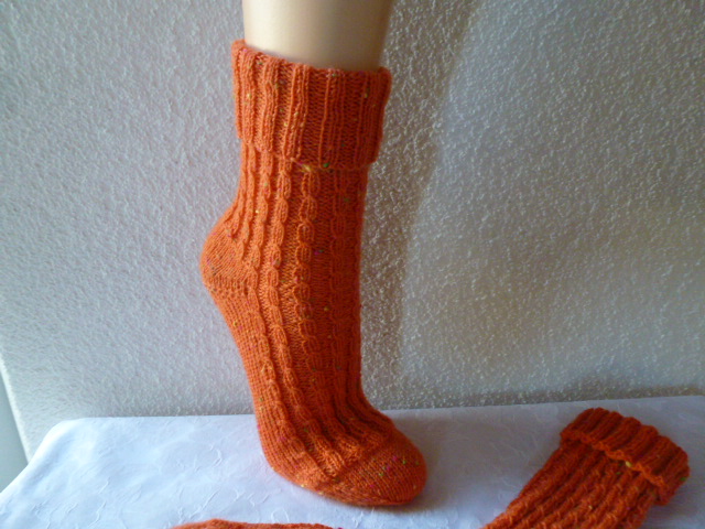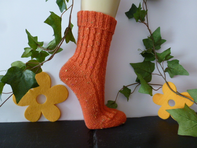 Diese handgestrickte Socke aus Tweed-Garn in sonnigem orange wurde mit einem Mini-Zopfmuster an Schaft und Oberfuß versehen. Das Bündchen ist zum Umschlagen extra breit gearbeitet und die Sohle ist glatt rechts gestrickt, damit im Schuh nichts drückt. Klassisches Muster in modernem Farbton.
